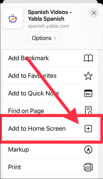 6. The following menu opens. Scroll down and select Add to Home Screen.